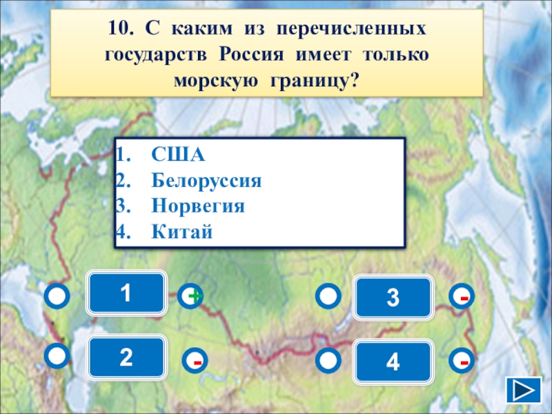 1--+-234СШАБелоруссияНорвегияКитай10. С каким из перечисленных государств Россия имеет только морскую границу?
