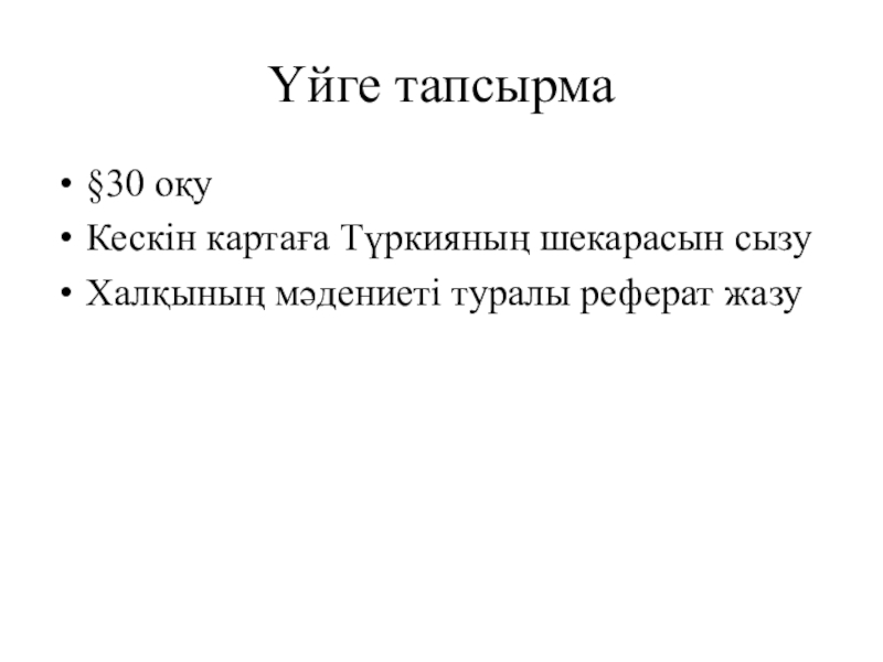 Үйге тапсырма§30 оқуКескін картаға Түркияның шекарасын сызуХалқының мәдениеті туралы реферат жазу