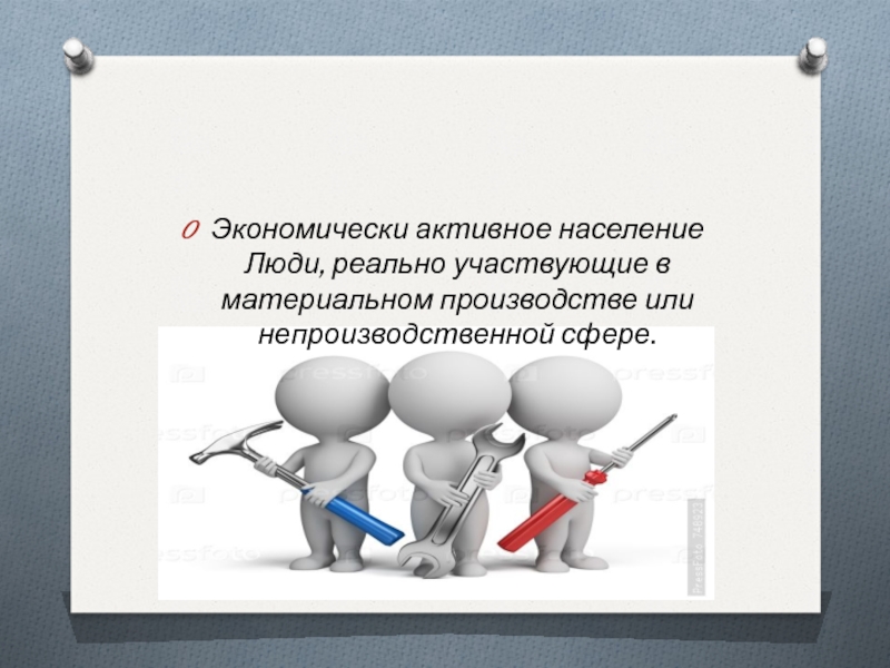 Слайд 6Экономически активное население Люди, реально участвующие в материальном производстве или непроизводственной
