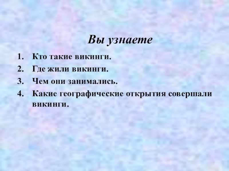 Вы узнаетеКто такие викинги.Где жили викинги.Чем они занимались.Какие географические открытия совершали викинги.