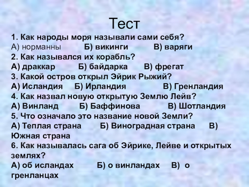 Тест1. Как народы моря называли сами себя?А) норманны     Б) викинги