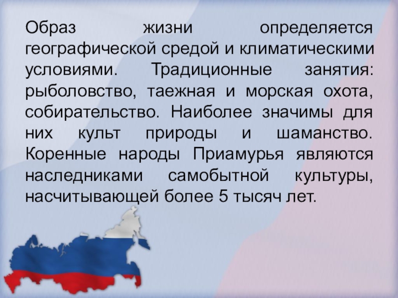 таежная и морская охота, собирательство. Наиболее значимы для них культ природы и шаманство. Коренные народы Приамурья являются наследниками самобытной культуры, насчитывающей более 5 тысяч лет.