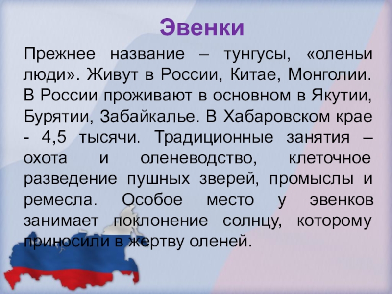 Монголии. В России проживают в основном в Якутии, Бурятии, Забайкалье. В Хабаровском крае - 4,5 тысячи. Традиционные занятия – охота и оленеводство, клеточное разведение пушных зверей, промыслы и ремесла. Особое место у эвенков занимает поклонение солнцу, которому приносили в жертву оленей.