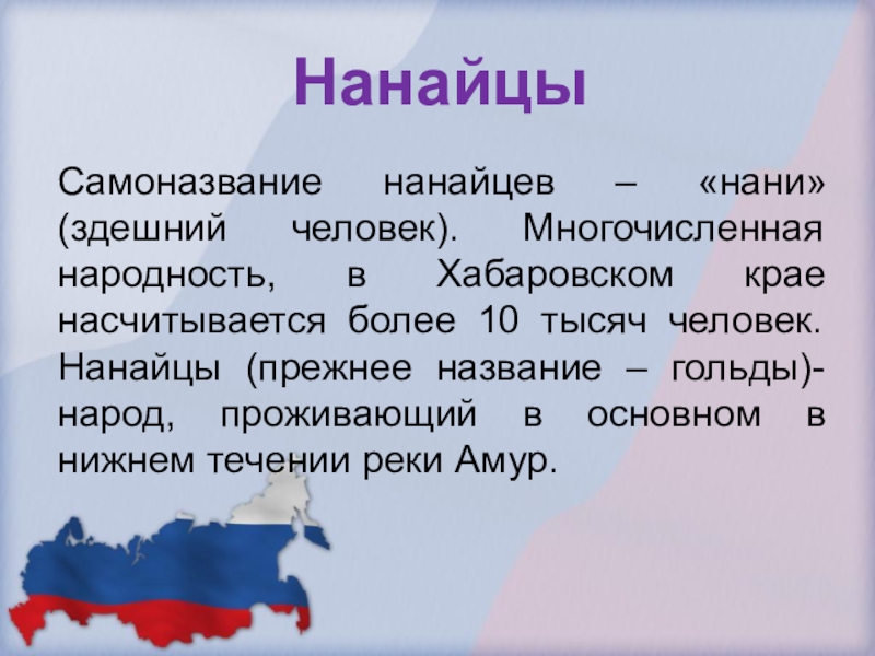 Самоназвание нанайцев – «нани» (здешний человек). Многочисленная народность, в Хабаровском