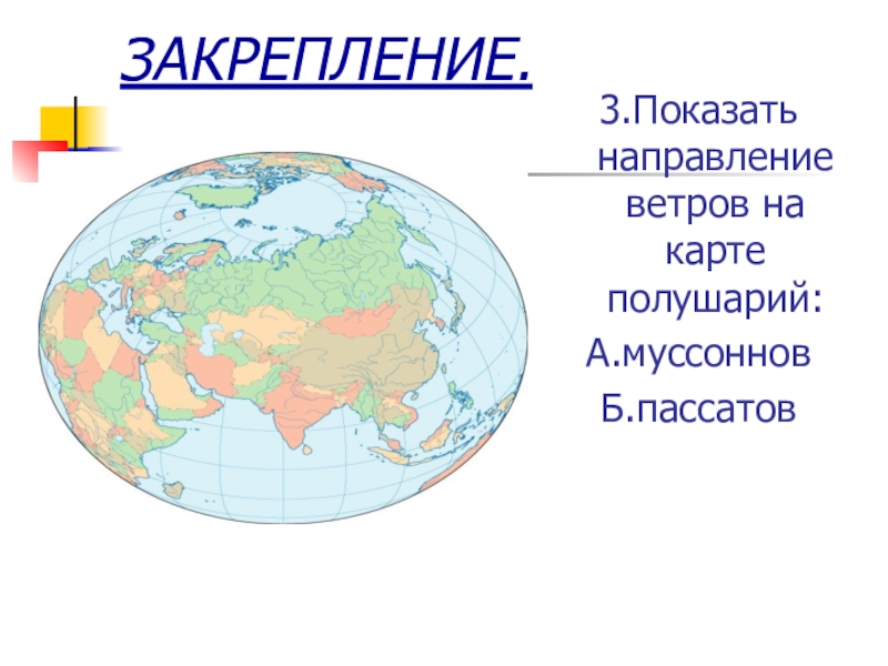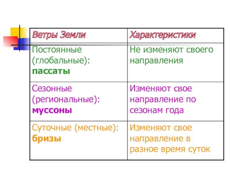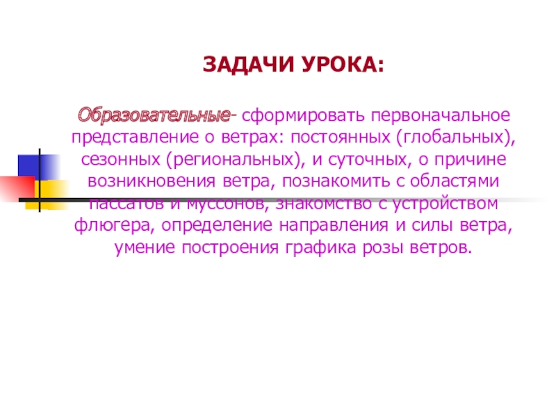 Образовательные- сформировать первоначальное представление о ветрах: постоянных (глобальных), сезонных (региональных),