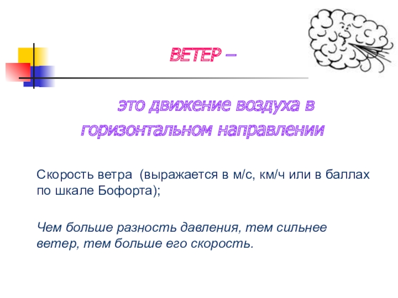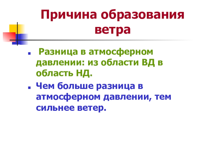 Чем больше разность давления, тем сильнее ветер, тем больше его скорость.