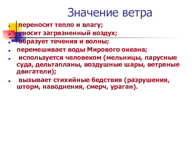 используется человеком (мельницы, парусные суда, дельтапланы, воздушные шары, ветряные двигатели);
