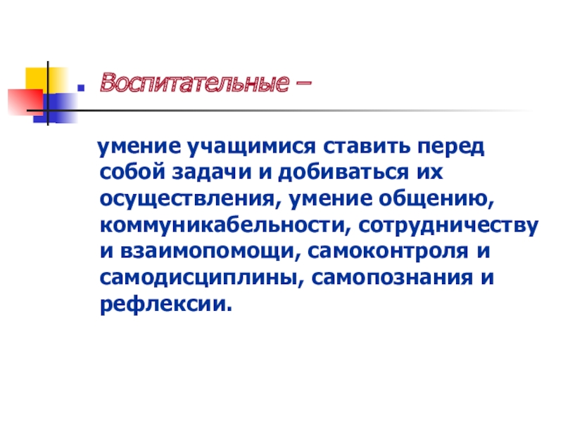 добиваться их осуществления, умение общению, коммуникабельности, сотрудничеству и взаимопомощи, самоконтроля и самодисциплины, самопознания и рефлексии.
