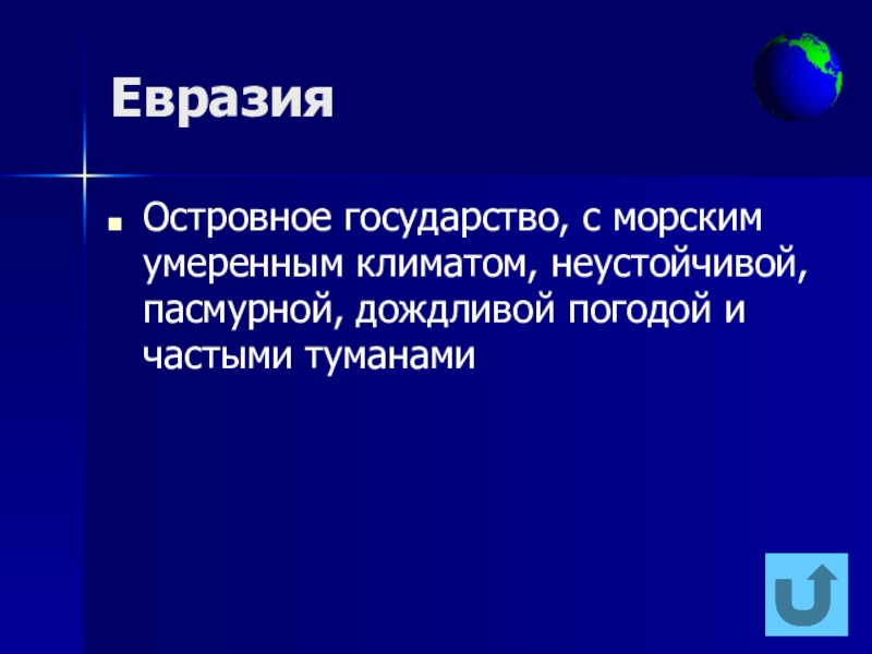 Евразия Островное государство, с морским умеренным климатом, неустойчивой, пасмурной, дождливой погодой и частыми туманами