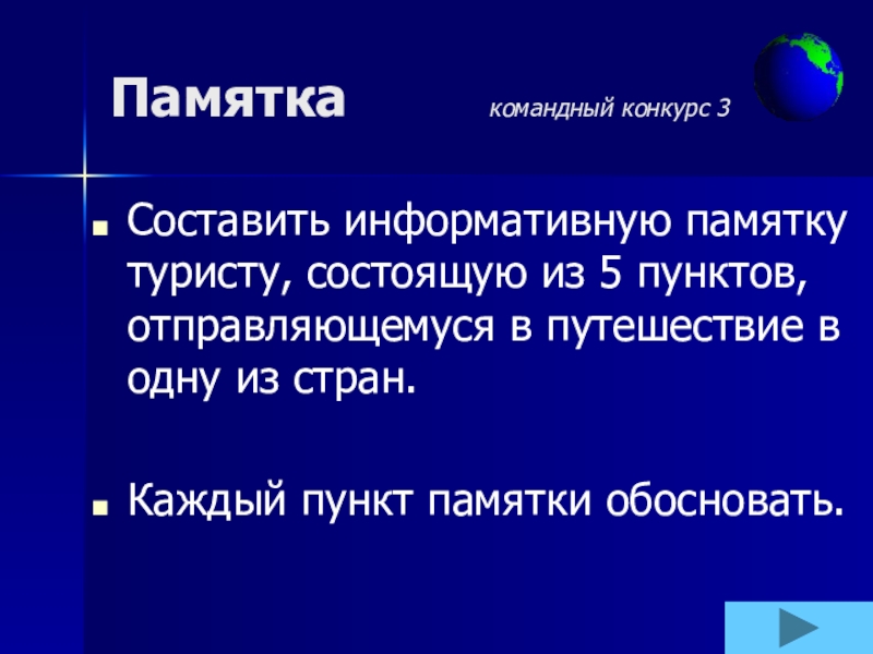 Памятка     командный конкурс 3Составить информативную памятку туристу, состоящую из 5 пунктов, отправляющемуся в
