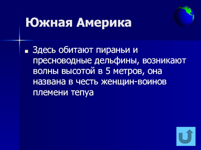 Южная АмерикаЗдесь обитают пираньи и пресноводные дельфины, возникают волны высотой в 5 метров, она названа в честь