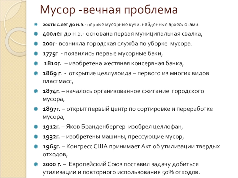 200тыс.лет до н.э.- первые мусорные кучи. найденные археологами.
