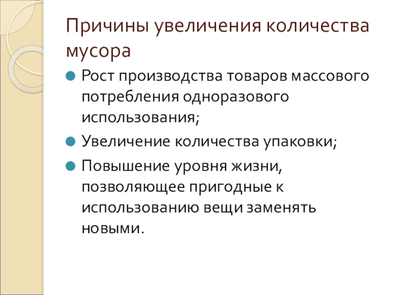 бумага , стекло, пластмасс, полиэтилен, пищевые отходы, ткани, металлические предметы.