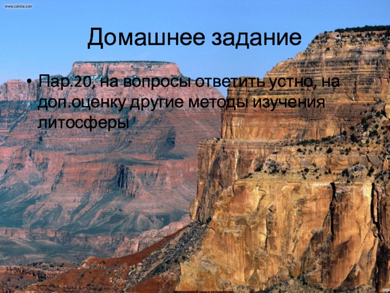 Домашнее заданиеПар.20, на вопросы ответить устно, на доп.оценку другие методы изучения литосферы