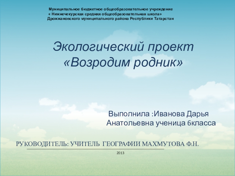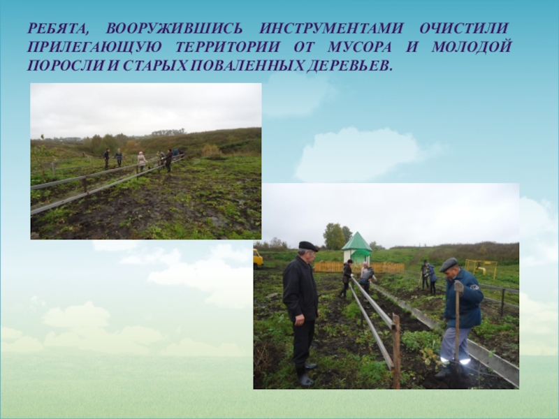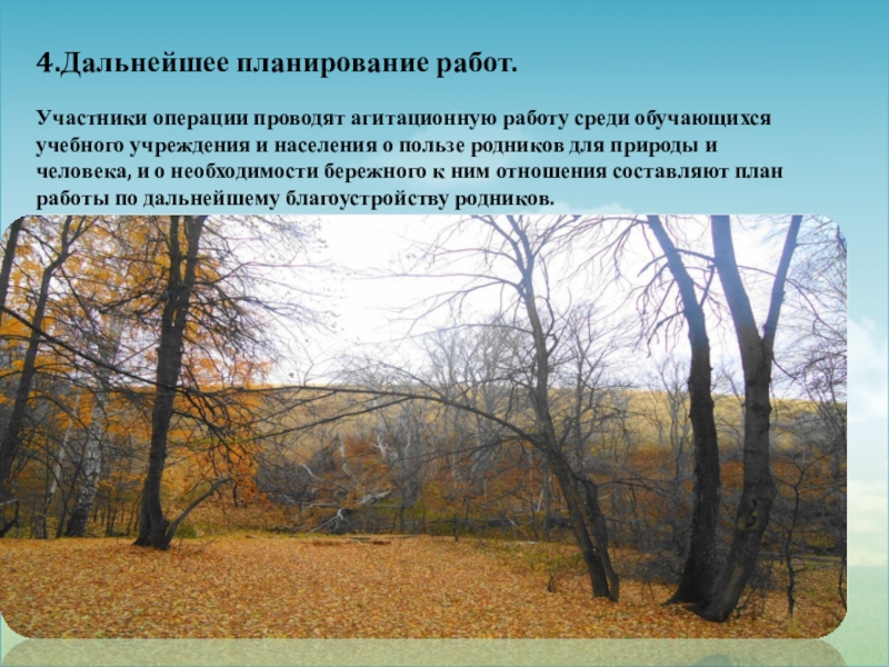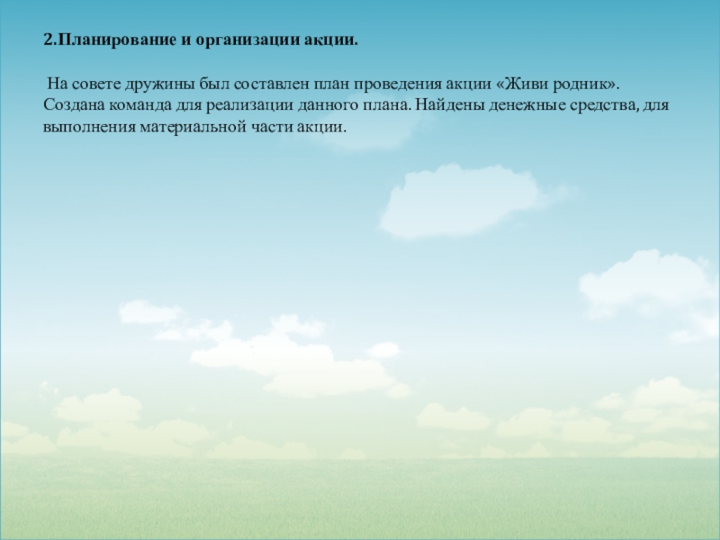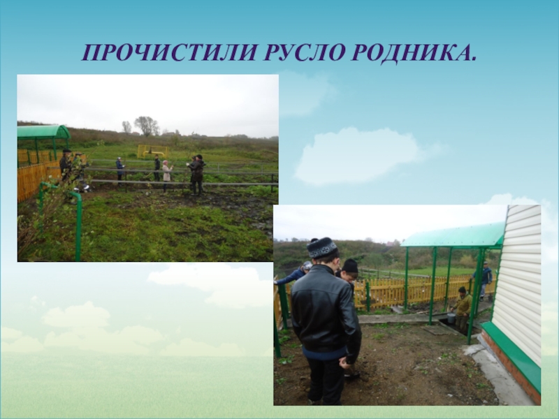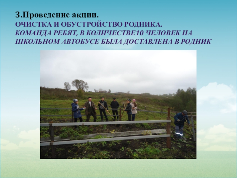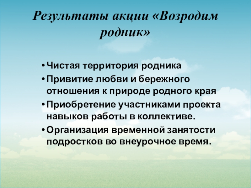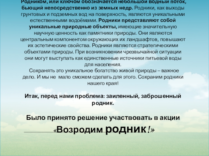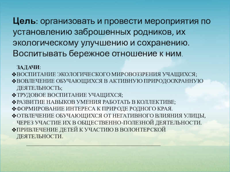 Цель: организовать и провести мероприятия по установлению заброшенных родников, их экологическому улучшению и сохранению. Воспитывать бережное отношение к ним.