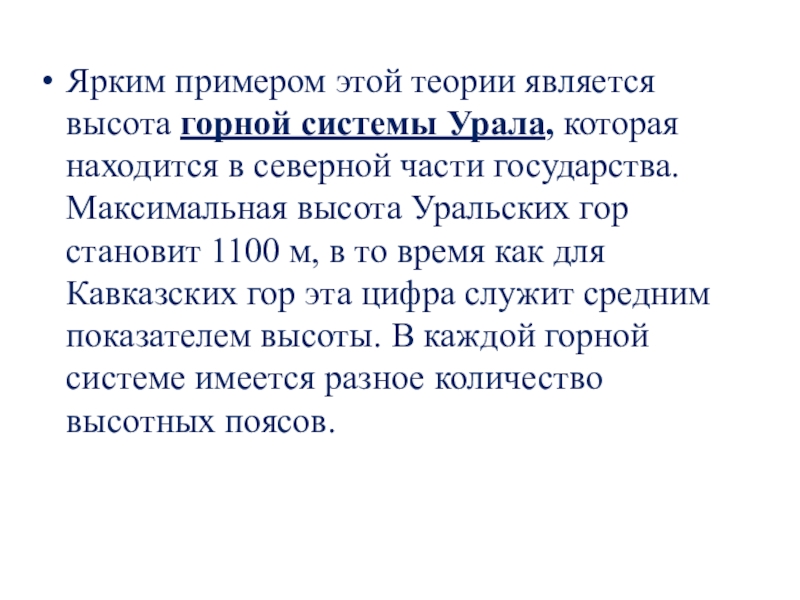 Слайд 10Ярким примером этой теории является высота горной системы Урала, которая находится в