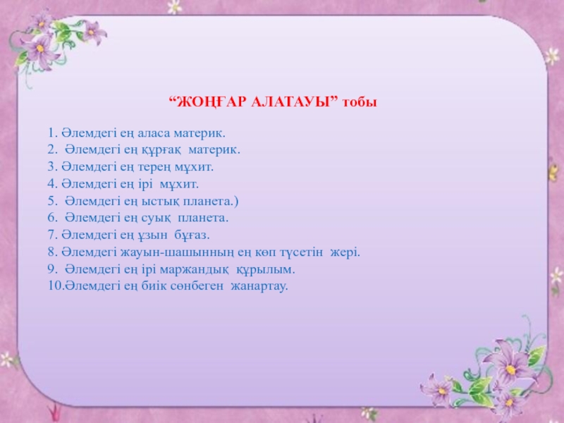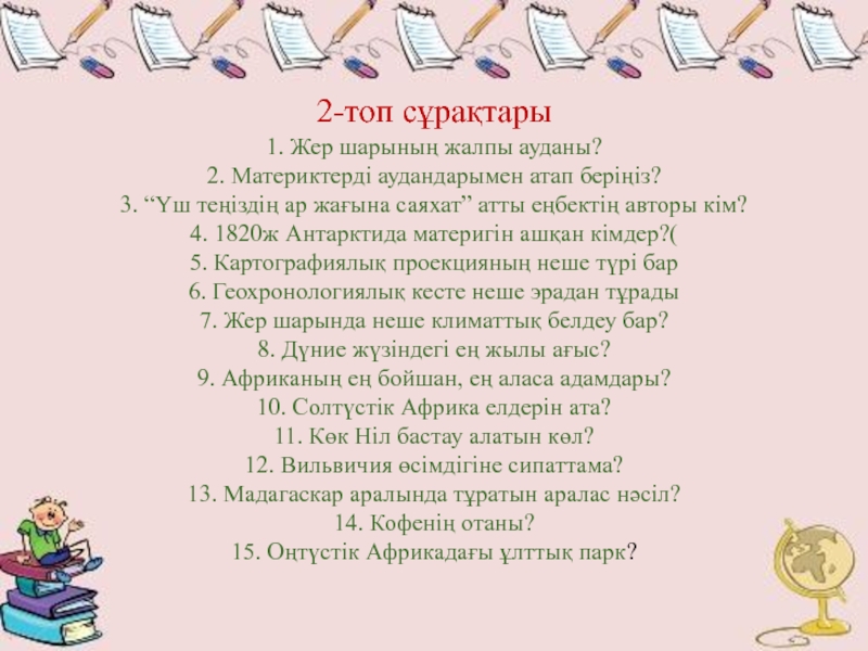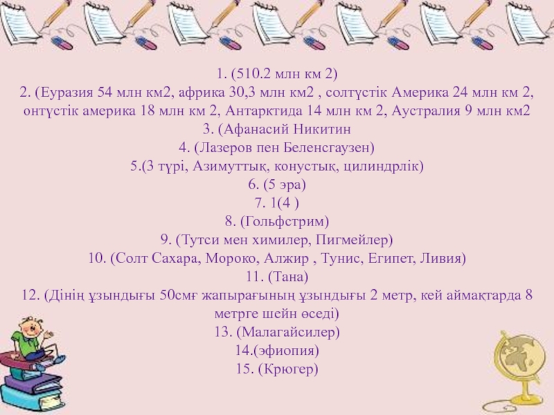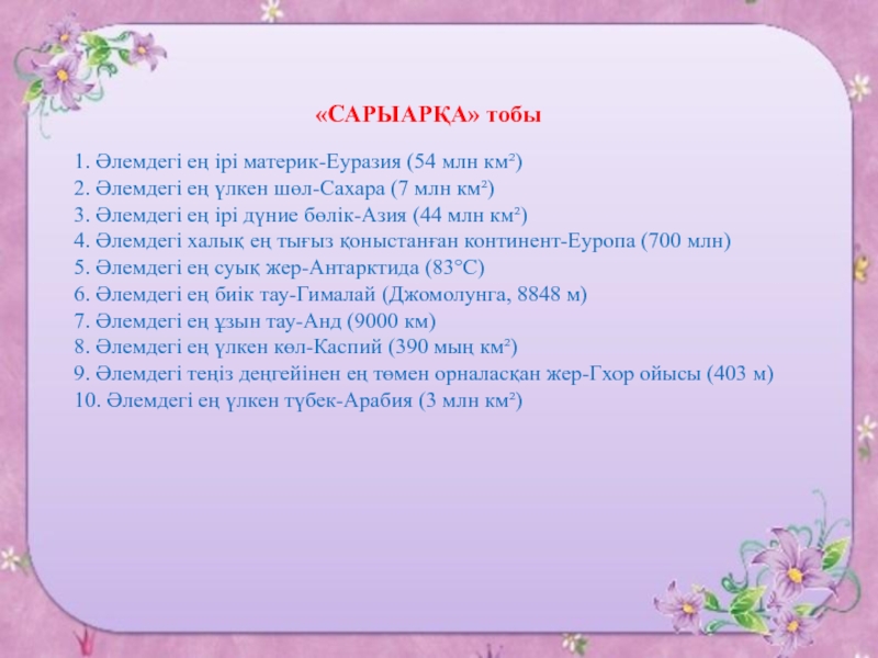млн км2 , солтүстік Америка 24 млн км 2, онтүстік америка 18 млн км 2, Антарктида 14 млн км 2, Аустралия 9 млн км2