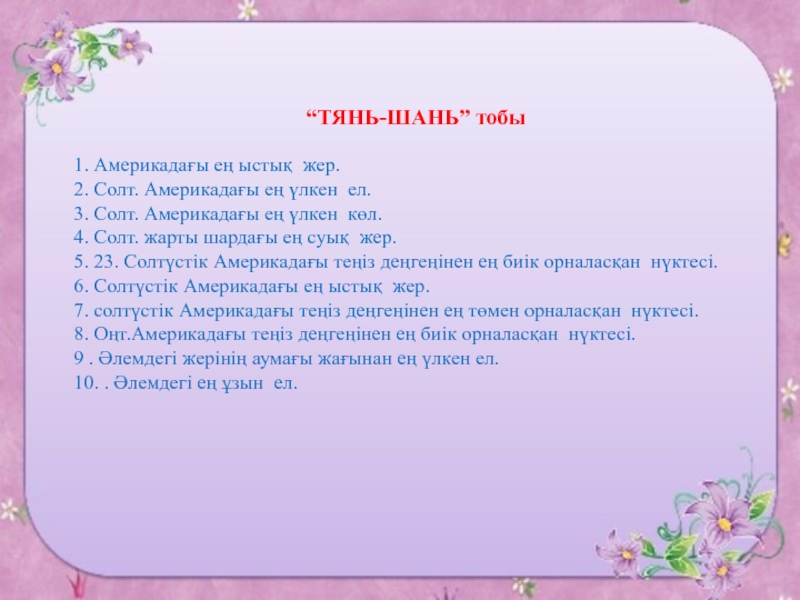 5. 23. Солтүстік Америкадағы теңіз деңгеңінен ең биік орналасқан нүктесі-Мак-Кенли шыңы (6193 м)