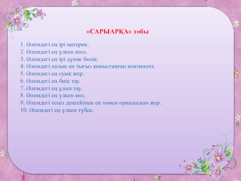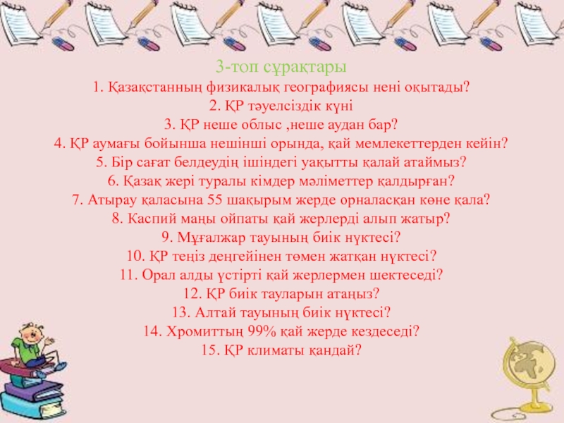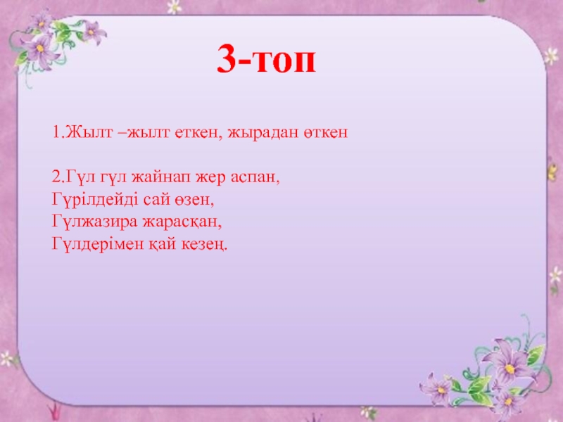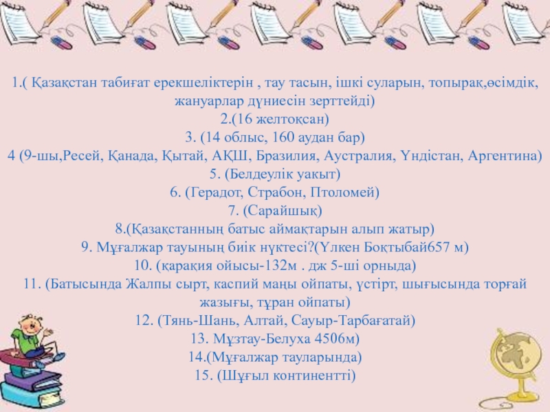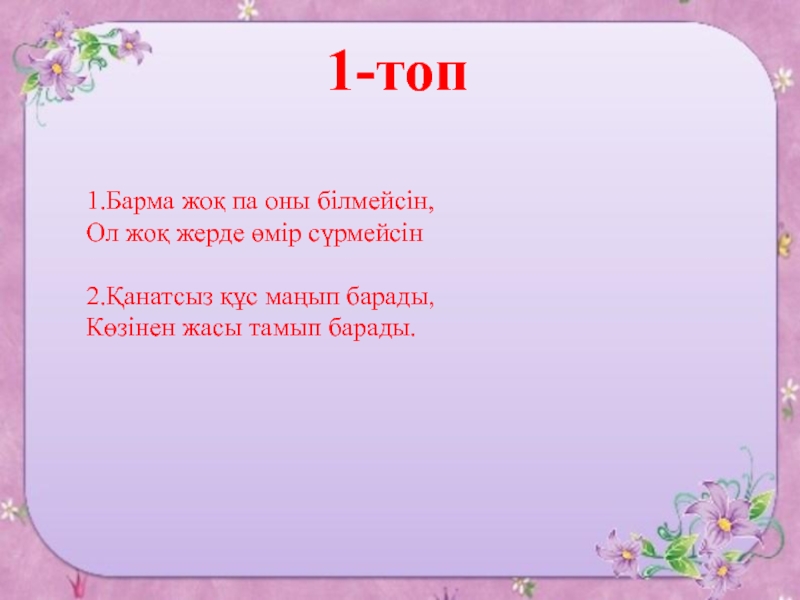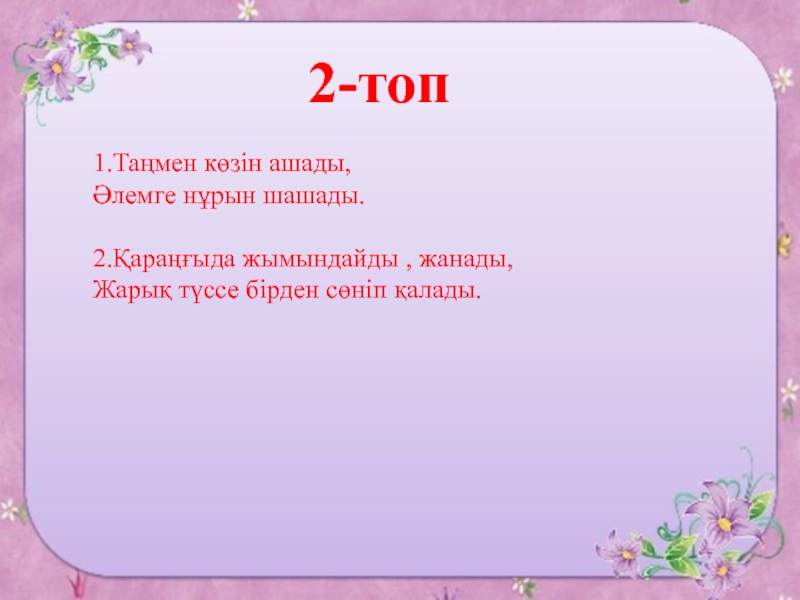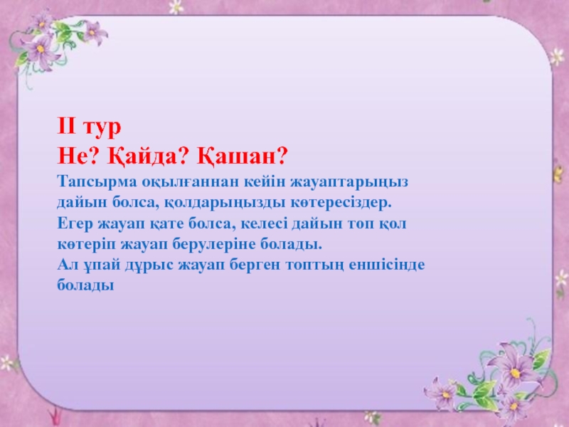 Тапсырма оқылғаннан кейін жауаптарыңыз дайын болса, қолдарыңызды көтересіздер.