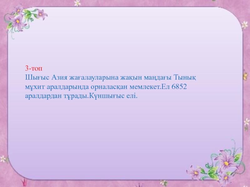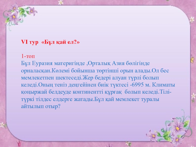 бойынша төртінші орын алады.Ол бес мемлекетпен шектеседі.Жер бедері алуан түрлі болып келеді.Оның теніз деңгейінен биік түктесі -6995 м. Климаты қоңыржай белдеуде континентті құрғақ болып келеді.Тілі-түркі тілдес елдерге жатады.Бұл қай мемлекет туралы айтылып отыр?