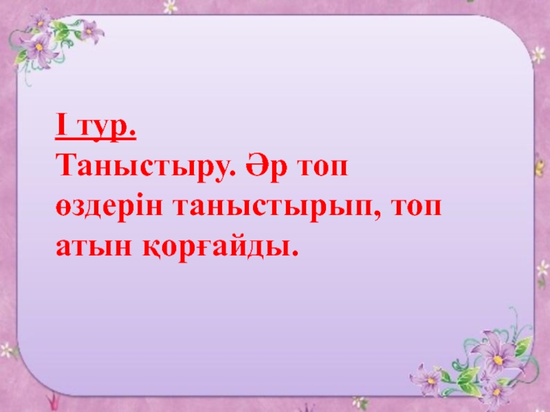 Таныстыру. Әр топ өздерін таныстырып, топ атын қорғайды.