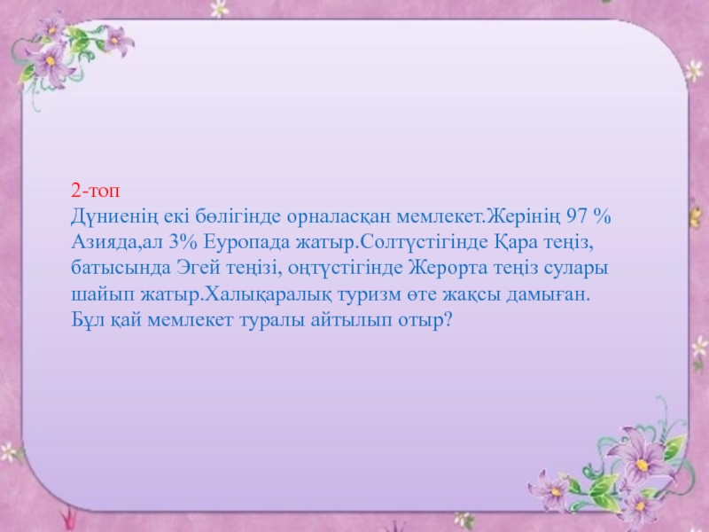 Қара теңіз,батысында Эгей теңізі, оңтүстігінде Жерорта теңіз сулары шайып жатыр.Халықаралық туризм өте жақсы дамыған. Бұл қай мемлекет туралы айтылып отыр?