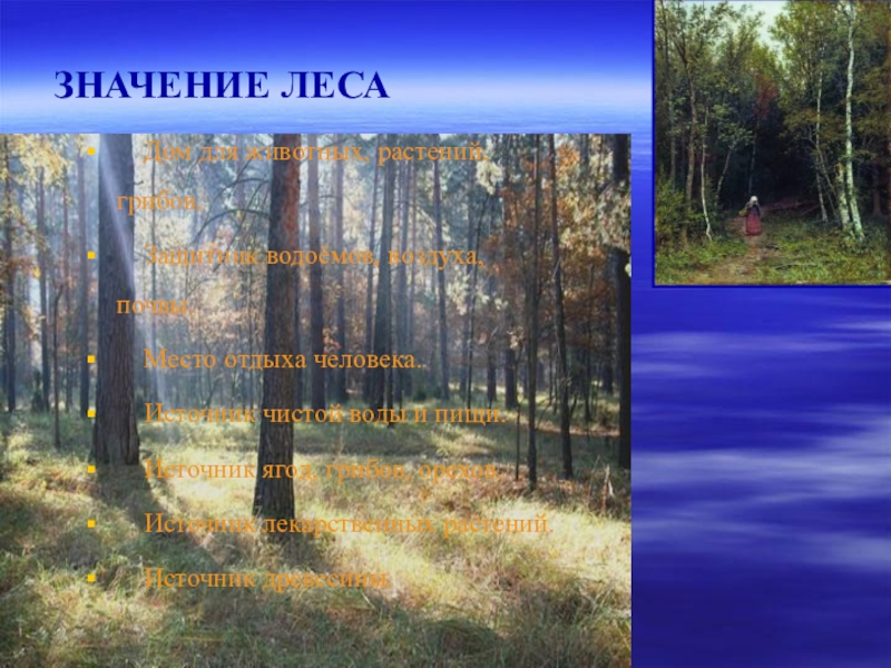Слайд 4ЗНАЧЕНИЕ ЛЕСА