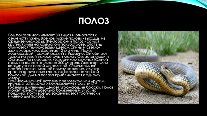 крымские полозы - выходцы из Средиземноморья. Желтобрюхий полоз - самая крупная змея на Крымском полуострове. Этот вид отличается темно-серым цветом спины и светло-желтым брюхом. Достигает 2 м длины. Полоз леопардовый - самый редкий в Украине. Он обитает только на узкой полосе суши между Севастополем и Судаком на поросших кустарником склонах Южной гряды на высоте не менее 300 метров. Окраска змеи варьирует от серой до палевой. Отличительной особенностью, давшей полозу название, служат красно-коричневые пятна, окантованные черной полоской. Длина полоза приближается к одному метру.