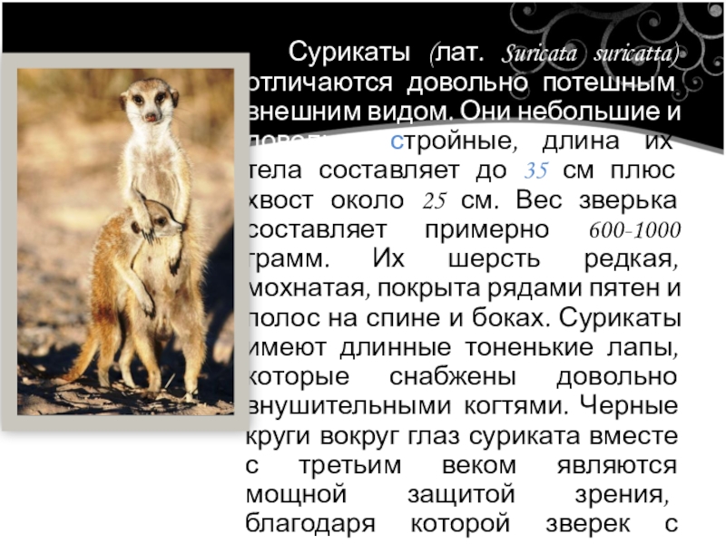 и довольно стройные, длина их тела составляет до 35 см плюс хвост около 25 см. Вес зверька составляет примерно 600-1000 грамм. Их шерсть редкая, мохнатая, покрыта рядами пятен и полос на спине и боках. Сурикаты имеют длинные тоненькие лапы, которые снабжены довольно внушительными когтями. Черные круги вокруг глаз суриката вместе с третьим веком являются мощной защитой зрения, благодаря которой зверек с легкостью может смотреть на солнце.