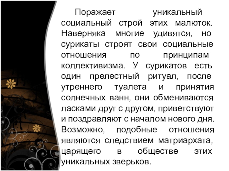 Слайд 8Поражает уникальный социальный строй этих малюток. Наверняка многие удивятся, но сурикаты