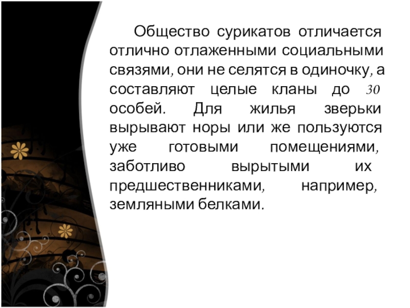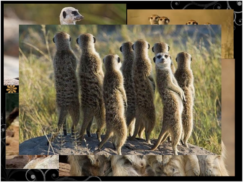 Слайд 6Общество сурикатов отличается отлично отлаженными социальными связями, они не селятся в