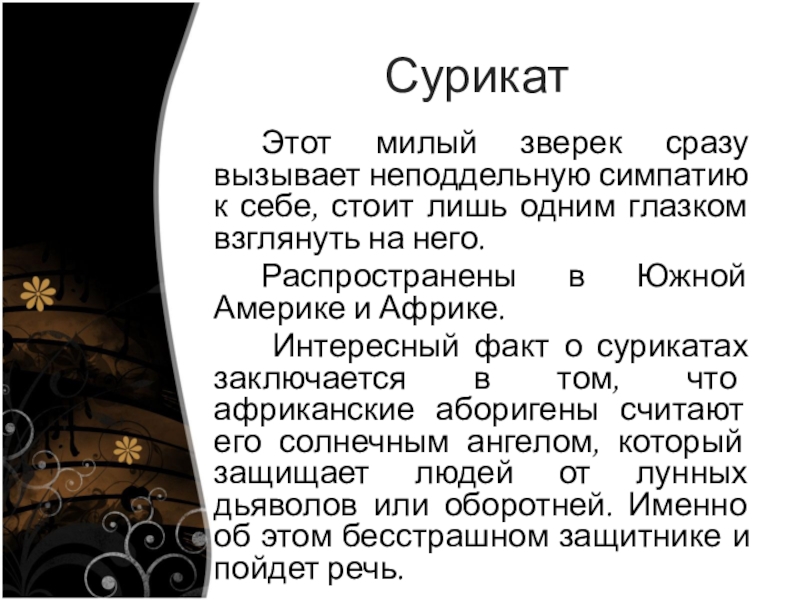 Слайд 4Сурикаты (лат. Suricata suricatta) отличаются довольно потешным внешним видом. Они небольшие