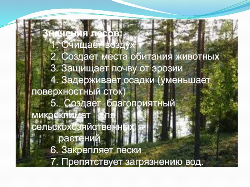 Значения лесов: 1. Очищает воздух 2. Создает места обитания животных 3. Защищает почву от эрозии 4. Задерживает осадки (уменьшает поверхностный сток)
