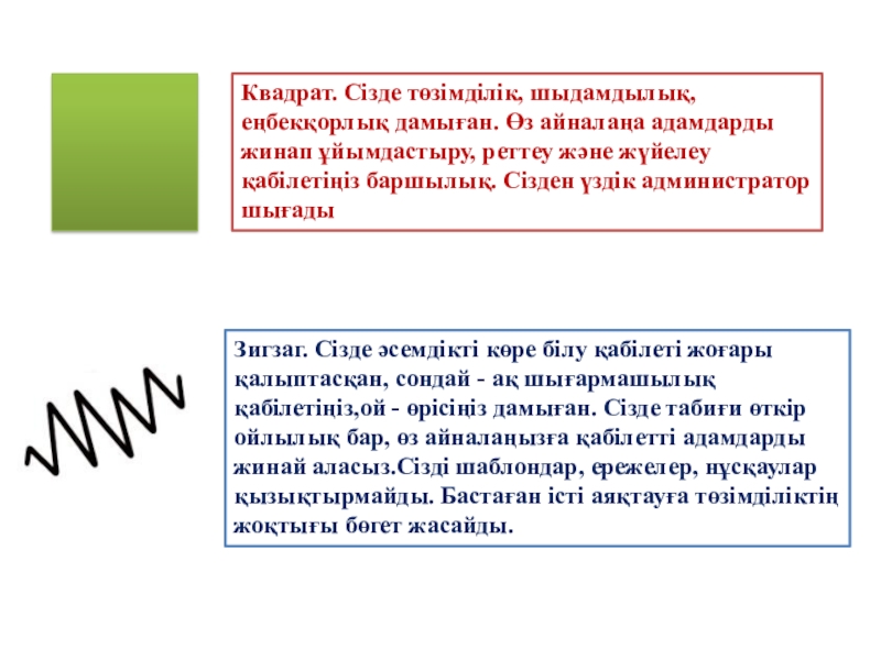Зигзаг. Сізде әсемдікті көре білу қабілеті жоғары қалыптасқан, сондай - ақ шығармашылық қабілетіңіз,ой - өрісіңіз дамыған. Сізде табиғи өткір ойлылық бар, өз айналаңызға қабілетті адамдарды жинай аласыз.Сізді шаблондар, ережелер, нұсқаулар қызықтырмайды. Бастаған істі аяқтауға төзімділіктің жоқтығы бөгет жасайды.
