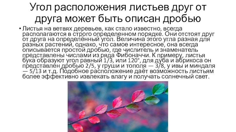 Слайд 5Угол расположения листьев друг от друга может быть описан дробью