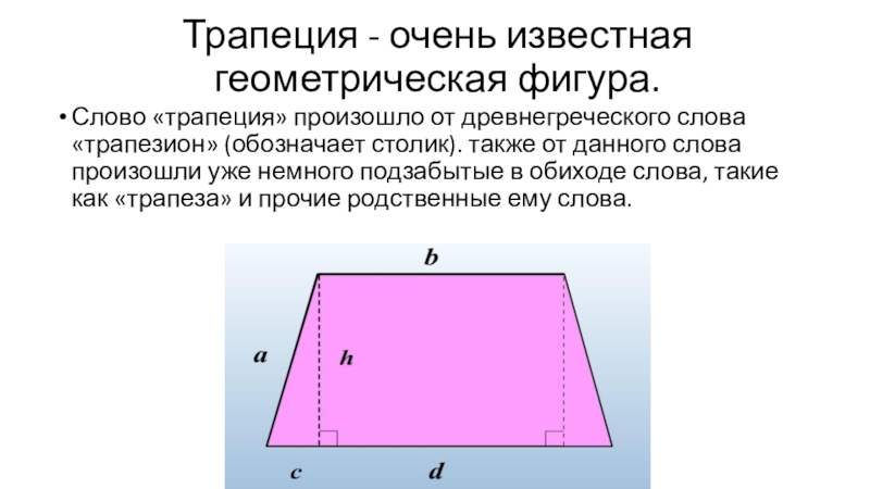Трапеция - очень известная геометрическая фигура.Слово «трапеция» произошло от древнегреческого слова «трапезион» (обозначает столик). также от данного