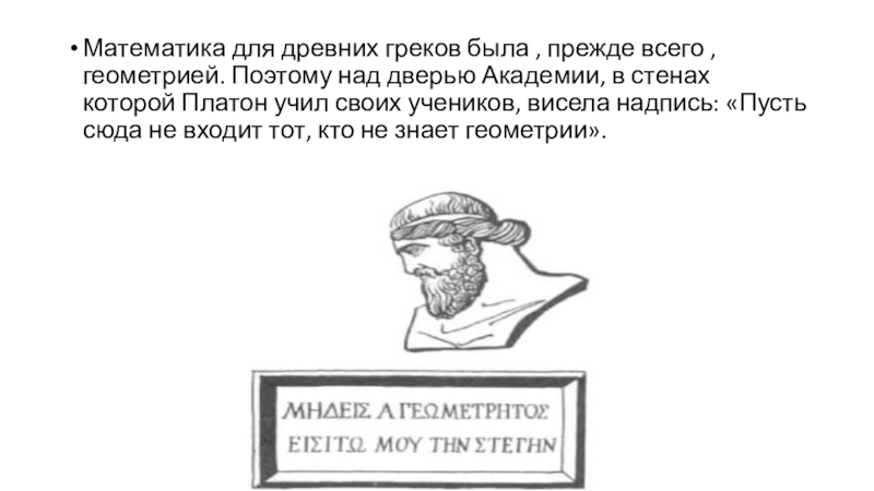 Математика для древних греков была , прежде всего , геометрией. Поэтому над дверью Академии, в стенах которой Платон учил своих учеников, висела надпись: «Пусть сюда не входит тот, кто не знает геометрии».