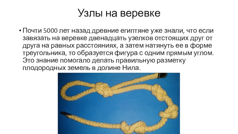 если завязать на веревке двенадцать узелков отстоящих друг от друга на равных расстояниях, а затем натянуть ее в форме треугольника, то образуется фигура с одним прямым углом. Это знание помогало делать правильную разметку плодородных земель в долине Нила.