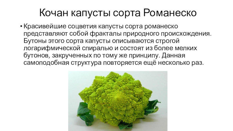 природного происхождения. Бутоны этого сорта капусты описываются строгой логарифмической спиралью и состоят из более мелких бутонов, закрученных по тому же принципу. Данная самоподобная структура повторяется ещё несколько раз.