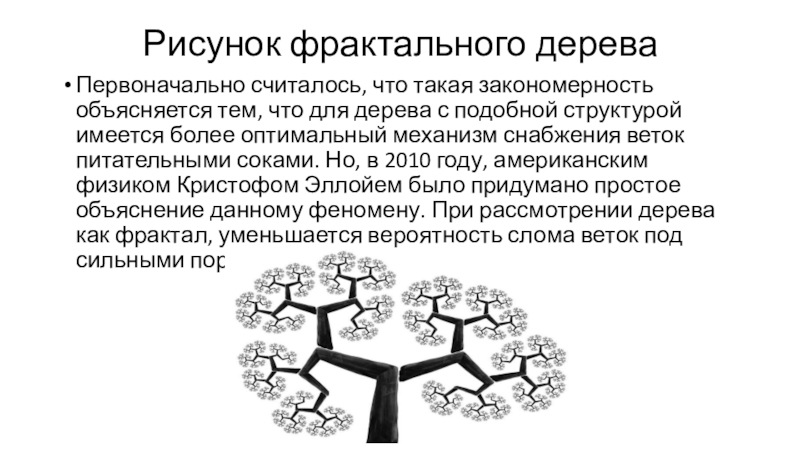 Рисунок фрактального дерева Первоначально считалось, что такая закономерность объясняется тем, что для дерева с подобной структурой имеется