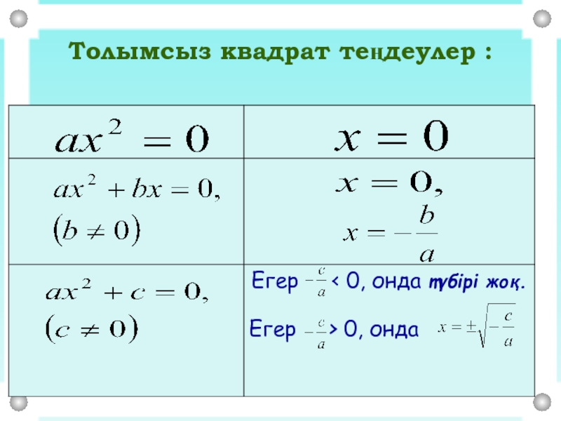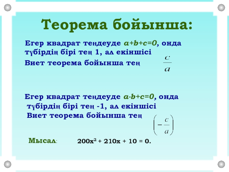 Егер квадрат теңдеуде a-b+c=0, онда түбірдің бірі тең -1, ал екіншісі
