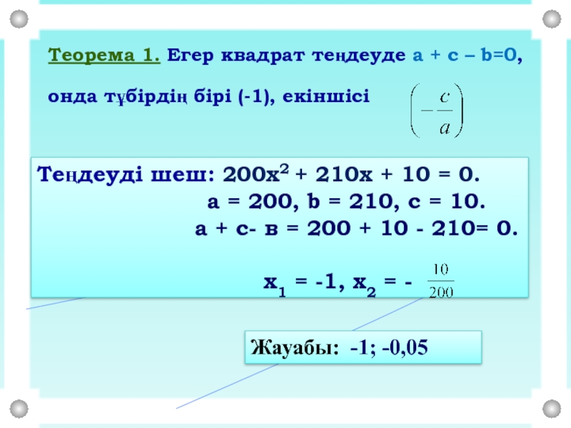 Теңдеуді шеш: 200х2 + 210х + 10 = 0.
