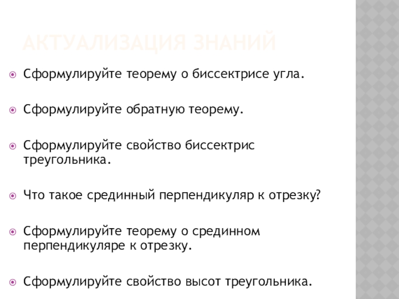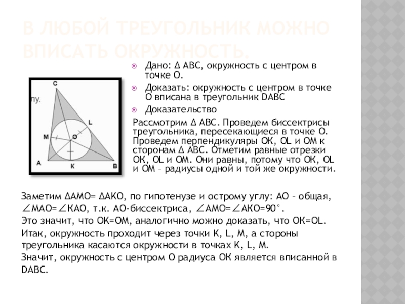 Это значит, что OK=OM, аналогично можно доказать, что ОК=OL. Итак, окружность проходит через точки K, L, M, а стороны треугольника касаются окружности в точках K, L, M.
