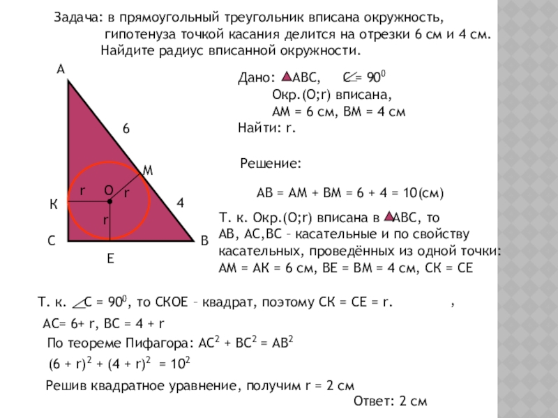 Значит, окружность с центром О радиуса ОК является вписанной в DАВС.