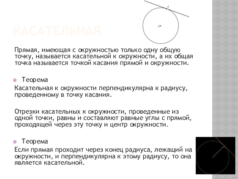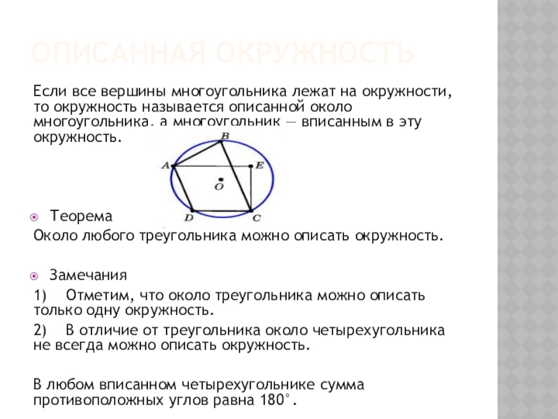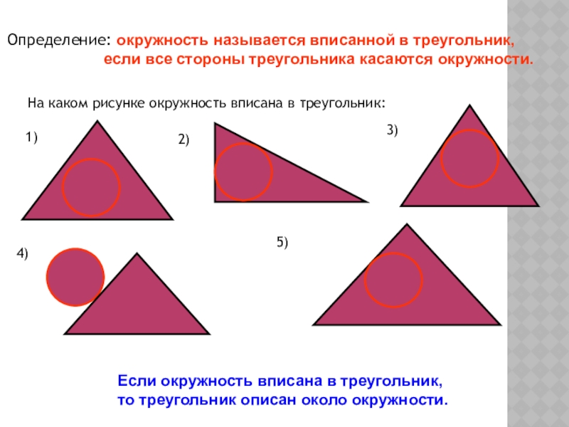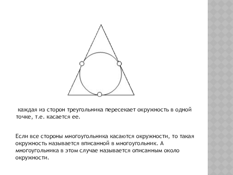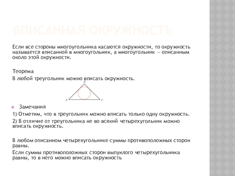 Если все стороны многоугольника касаются окружности, то такая окружность называется вписанной в многоугольник. А многоугольника в этом случае называется описанным около окружности.