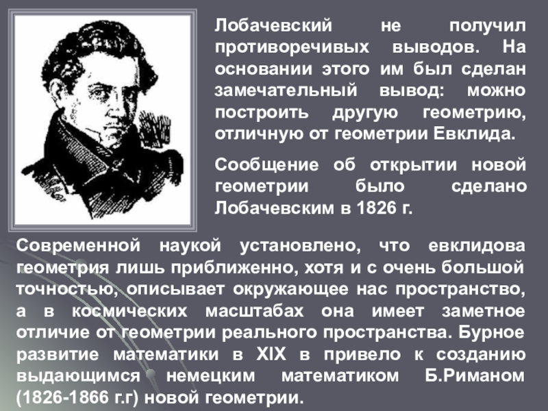 Современной наукой установлено, что евклидова геометрия лишь приближенно, хотя и с очень большой точностью, описывает окружающее нас пространство, а в космических масштабах она имеет заметное отличие от геометрии реального пространства. Бурное развитие математики в XIX в привело к созданию выдающимся немецким математиком Б.Риманом (1826-1866 г.г) новой геометрии.