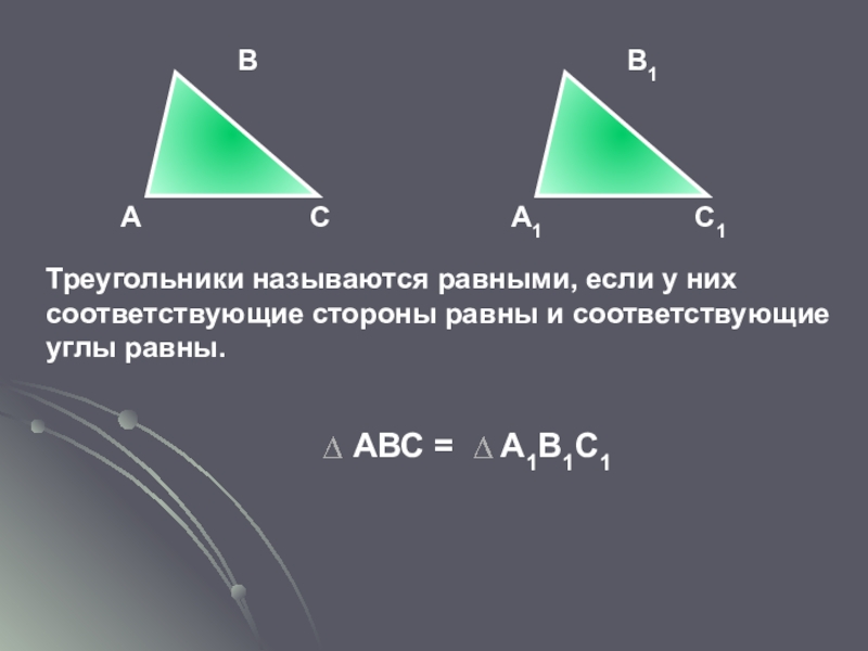 Треугольники называются равными, если у них соответствующие стороны равны и соответствующие углы равны.