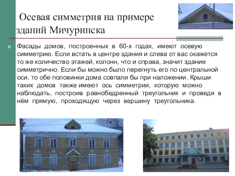годах, имеют осевую симметрию. Если встать в центре здания и слева от вас окажется то же количество этажей, колонн, что и справа, значит здание симметрично. Если бы можно было перегнуть его по центральной оси, то обе половинки дома совпали бы при наложении. Крыши таких домов также имеют ось симметрии, которую можно наблюдать, построив равнобедренный треугольник и проведя в нём прямую, проходящую через вершину треугольника.