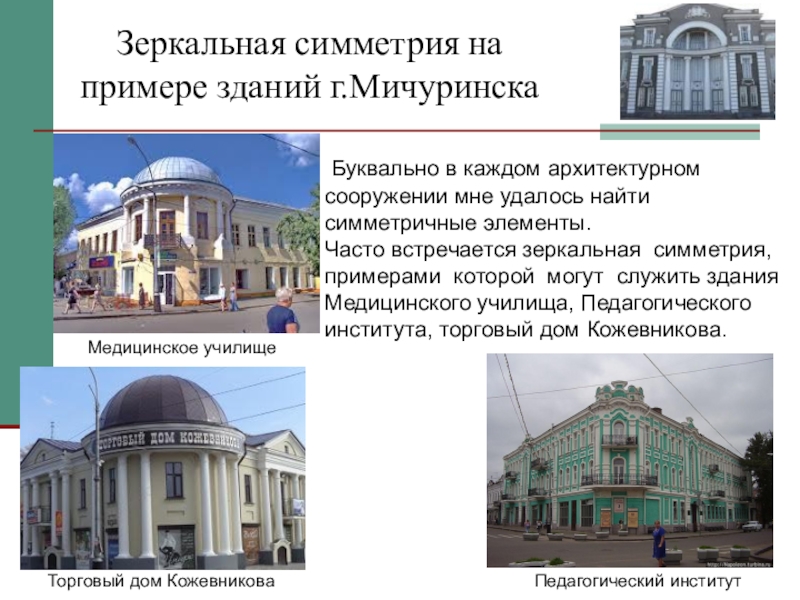 Слайд 9Зеркальная симметрия на примере зданий г.Мичуринска