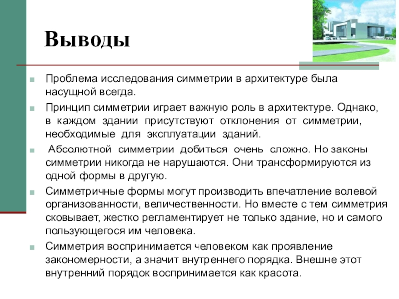 играет важную роль в архитектуре. Однако, в каждом здании присутствуют отклонения от симметрии, необходимые для эксплуатации зданий.
